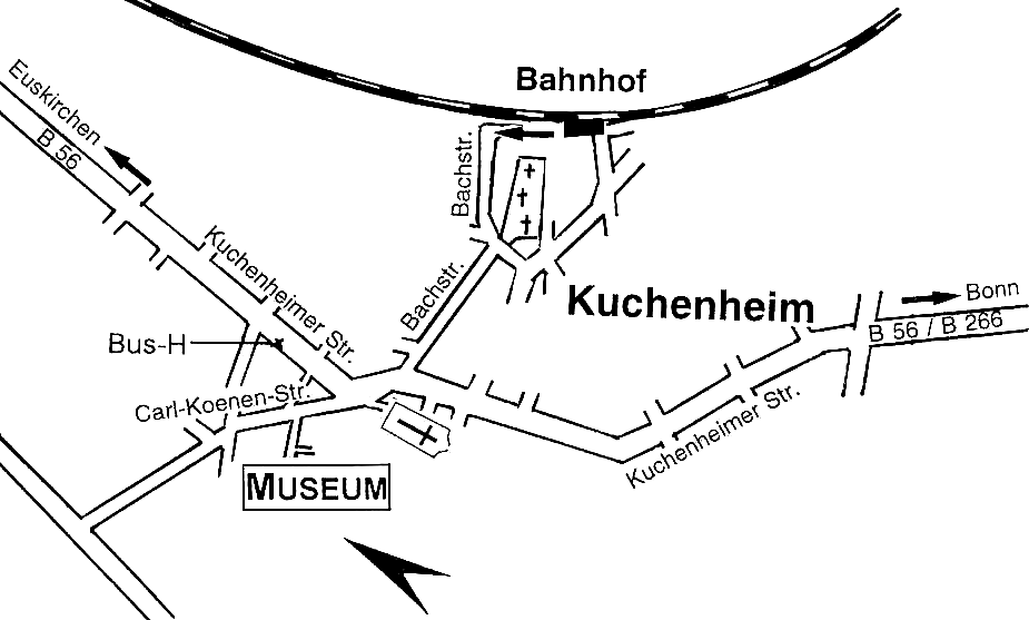 Aus Richtung Köln: Montag-Samstag: mit dem Zug halbstündlich bis Bahnhof Euskirchen, dann Stadtbus 874 Richtung Kirchheim bis Haltestelle Kuchenheim, Händelstraße, dann 3 Minuten Fußweg. Sonntag: Umsteigen am Bahnhof Euskirchen in den Zug Richtung Bonn bis Bahnhof Kuchenheim, dann 15 Minuten Fußweg.