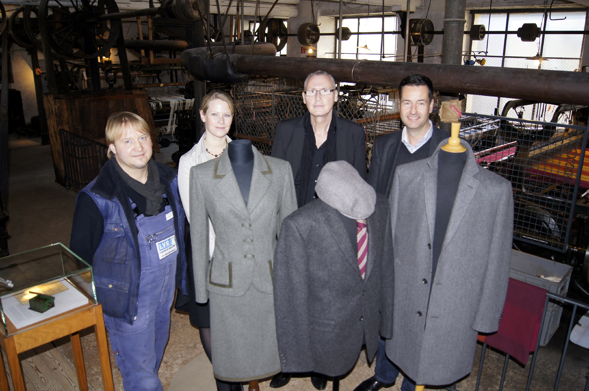 In diesem Jahr konnte dann auch wieder so viel Tuch produziert werden, dass sich der Start einer kleinen Sakko- und Mantelkollektion wieder lohnte. Thorsten Loeb, der früher in seinem Geschäft am Alten Markt in Euskirchen, bereits Herrenartikel aus Müllertuch anbot, konnte nun seinen neuen Arbeitgeber, die Fa. Ley für die Kooperation mit dem Museum begeistern. Die aktuelle Kollektion mit einem Sakkomantel in modernem Schnitt im traditionellen Fischgrat für 399 € und und einem Sakko in grauem Tweed (299 €) wird in Museumsshop in Kuchenheim und in der Ley-Filiale in Bonn verkauft. Eckhardt Ringen, Filial-Leiter in Bonn, ist ein bekennender „Stoff-Freak“ und war erst skeptisch: „Nicht, dass das so selbstgestrickt aussieht.“ Jetzt ist er hingerissen von der ganz besonderen Qualität des Müller-Tuchs in der typischen Tweed-Optik, das etwas dichter gewebt und sehr strapazierfähig ist. „Das ist doch ein wunderbarer Griff und total modern im Schnitt. Und ein echtes Unikat.“